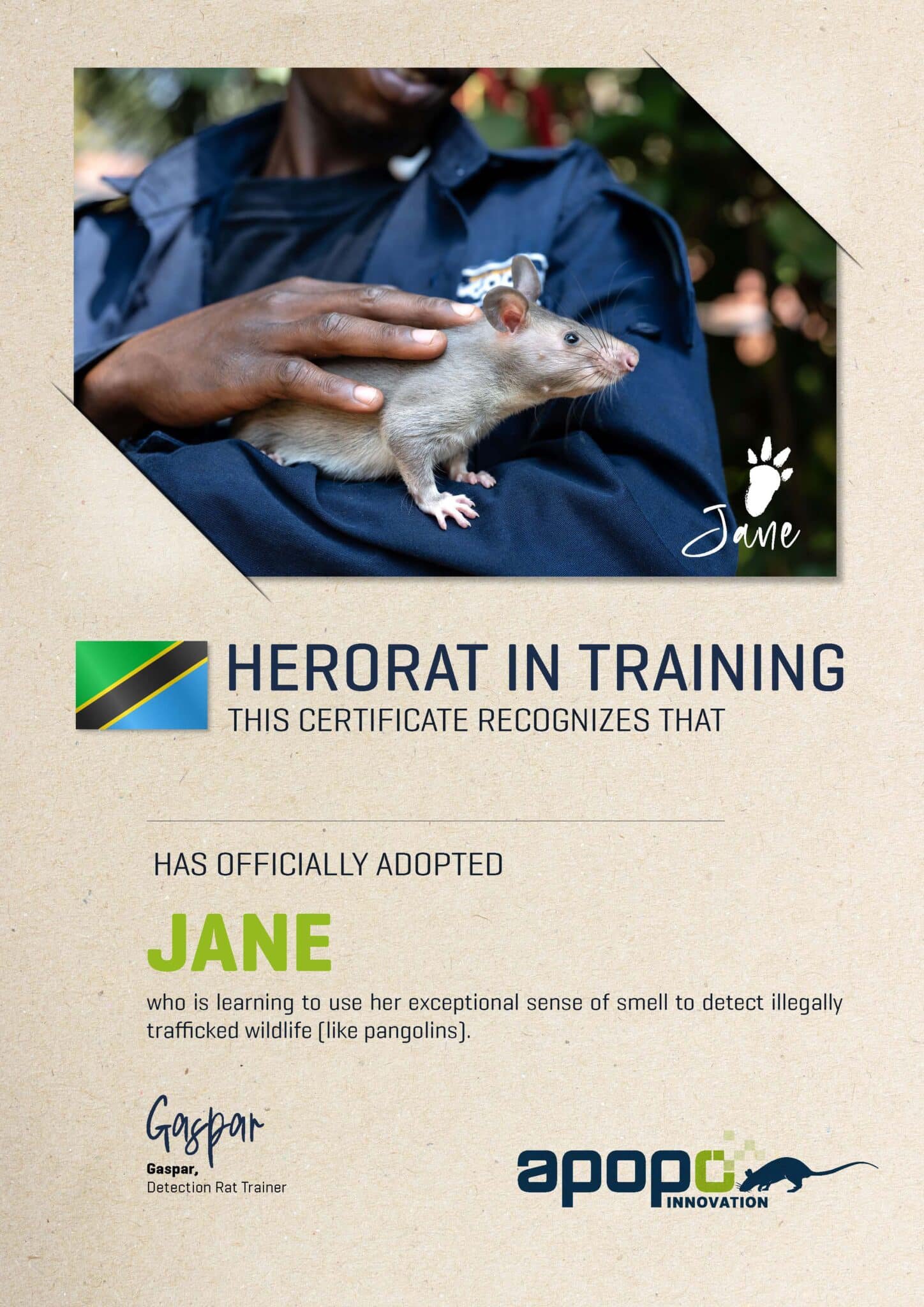 Jane is a young female wildlife detection rat based in Morogoro, home to APOPO’s Training and Innovation Center in Tanzania. HeroRAT Jane is on a mission to help protect some of the world’s most threatened wildlife. Named by Dr. Jane Goodall during her visit to APOPO in July 2024, HeroRAT Jane is training to detect illegally trafficked wildlife products, including pangolin scales, rhino horn, and elephant ivory. With your support, Jane can learn the skills she needs to make a difference and help disrupt wildlife trafficking networks.